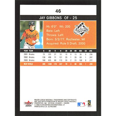 This is a 2004 Ultra Jay Gibbons baseball card. The card is #46 and pictures show condition.