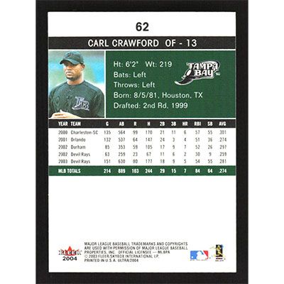 This is a 2004 Ultra Carl Crawford baseball card. The card is #62 and pictures show condition.