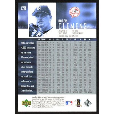 This is a 2004 Upper Deck Roger Clemens baseball card. The card is #128 and pictures show condition.