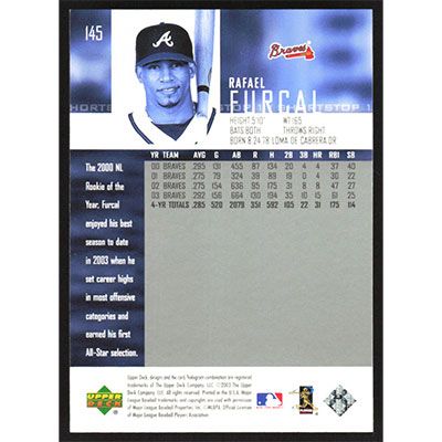 This is a 2004 Upper Deck Rafael Furcal baseball card. The card is #145 and pictures show condition.