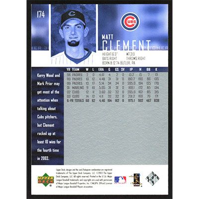 This is a 2004 Upper Deck Matt Clement baseball card. The card is #174 and pictures show condition.