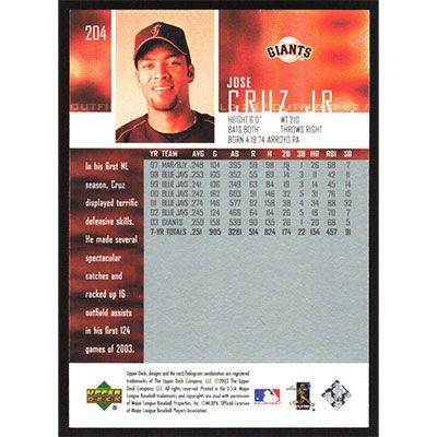 This is a 2004 Upper Deck Jose Cruz Jr. baseball card. The card is #204 and pictures show condition.