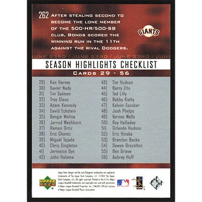 This is a 2004 Upper Deck Barry Bonds Season Highlights Checklist baseball card. The card is #262 and pictures show condition. Team(s): San Francisco Giants