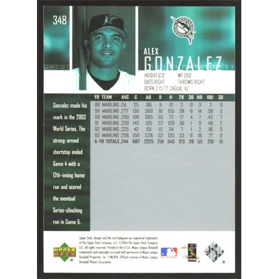 This is a 2004 Upper Deck Alex Gonzalez baseball card. The card is #348 and pictures show condition.