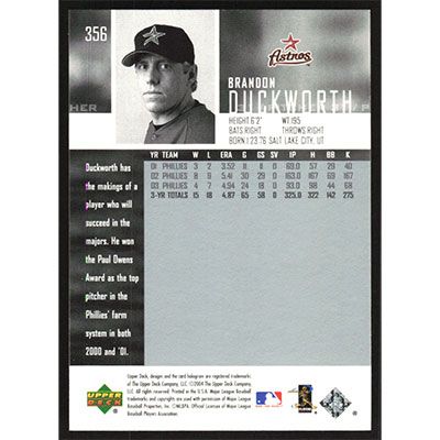 This is a 2004 Upper Deck Brandon Duckworth baseball card. The card is #356 and pictures show condition.