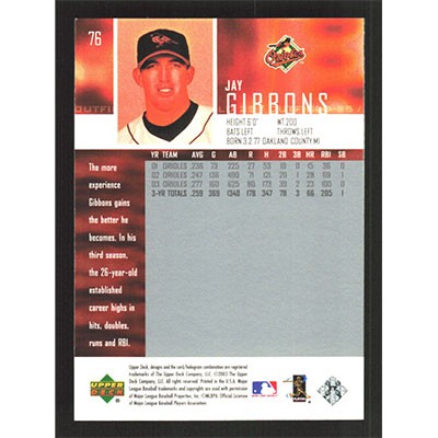 This is a 2004 Upper Deck Jay Gibbons baseball card. The card is #76 and pictures show condition.