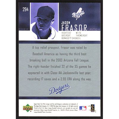 This is a 2004 Upper Deck First Pitch Jason Frasor Star Rookies baseball card. The card is #294 and pictures show condition. Team(s): Los Angeles Dodgers Rookie Card (RC)