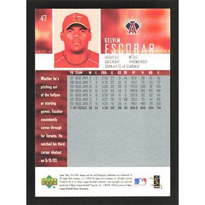 This is a 2004 Upper Deck First Pitch Kelvim Escobar baseball card. The card is #47 and pictures show condition.