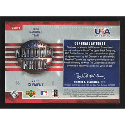 This is a 2004 Upper Deck National Pride Jeff Clement Jersey baseball card. The card is #USA10 and pictures show condition.