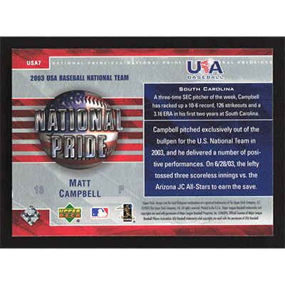 This is a 2004 Upper Deck National Pride Matt Campbell baseball card. The card is #USA7 and pictures show condition.