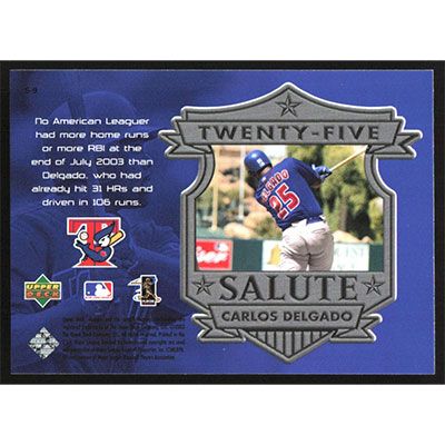 This is a 2004 Upper Deck Twenty-Five Salute Carlos Delgado baseball card. The card is #S-9 and pictures show condition.