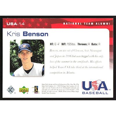 This is a 2004 USA Baseball 25th Anniversary Kris Benson autographed baseball card. This card has been signed, in blue, by Kris Benson, and is guaranteed authentic by Ballcardz.com. The card is #USA-14 and pictures show condition.