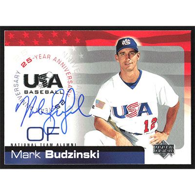 This is a 2004 USA Baseball 25th Anniversary Mark Budzinski autographed baseball card. This card has been signed, in blue, by Mark Budzinski, and is guaranteed authentic by Ballcardz.com. The card is #USA-28 and pictures show condition.