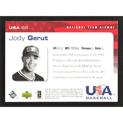 This is a 2004 USA Baseball 25th Anniversary Jody Gerut autographed baseball card. This card has been signed, in blue, by Jody Gerut, and is guaranteed authentic by Ballcardz.com. The card is #USA-66 and pictures show condition.