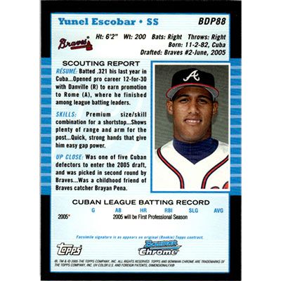 This is a 2005 Bowman Chrome Draft Yunel Escobar baseball card. The card is #BDP88 and pictures show condition. Team(s): Atlanta Braves Rookie Card (RC)
