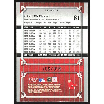 This is a 2005 Classic Clippings Carlton Fisk baseball card. The card is #81 and pictures show condition. This card is limited; #'d 706/999. Team(s): Boston Red Sox