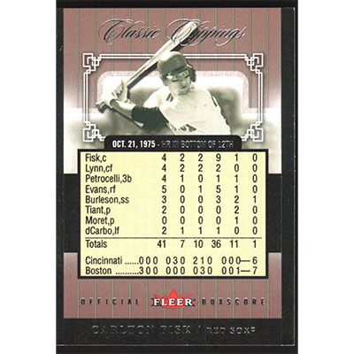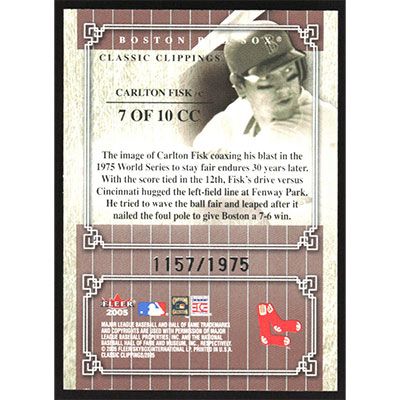 This is a 2005 Classic Clippings Official Box Score Carlton Fisk baseball card. The card is #7 and pictures show condition. This card is limited; #'d 1157/1975.