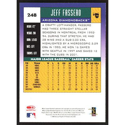 This is a 2005 Donruss Jeff Fassero baseball card. The card is #248 and pictures show condition.