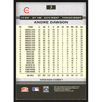 This is a 2005 Donruss Greats Andre Dawson baseball card. The card is #3 and pictures show condition.