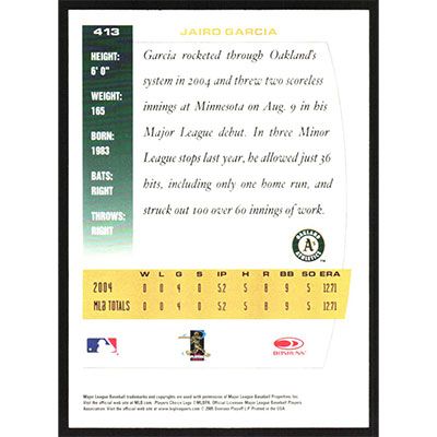 This is a 2005 Donruss Team Heroes Jairo Garcia baseball card. The card is #413 and pictures show condition.