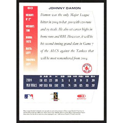 This is a 2005 Donruss Team Heroes Johnny Damon baseball card. The card is #60 and pictures show condition.