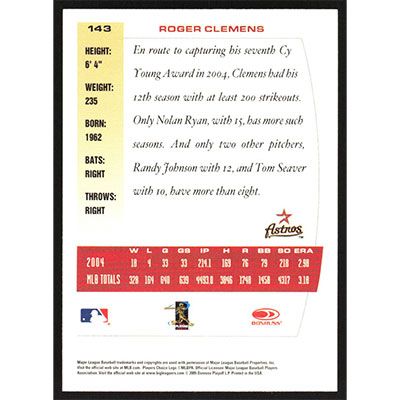 This is a 2005 Donruss Team Heroes Showdown Blue Roger Clemens baseball card. The card is #143 and pictures show condition.