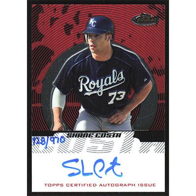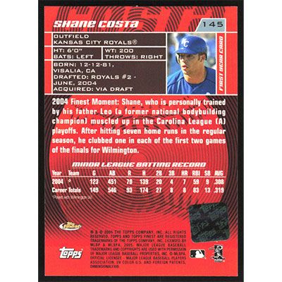 This is a 2005 Finest Shane Costa autographed baseball card. This card has been signed, in blue, by Shane Costa, and is certified authentic by Topps. The card is #145 and pictures show condition. This card is limited; #'d 928/970.
