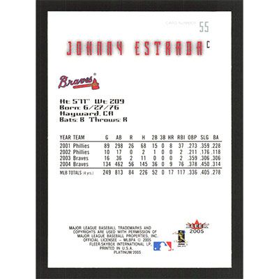 This is a 2005 Fleer Platinum Johnny Estrada autographed baseball card. This card has been signed, in blue, by Johnny Estrada, and is guaranteed authentic by Ballcardz.com. The card is #55 and pictures show condition.