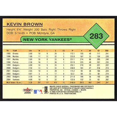 This is a 2005 Fleer Tradition Kevin Brown baseball card. The card is #283 and pictures show condition.
