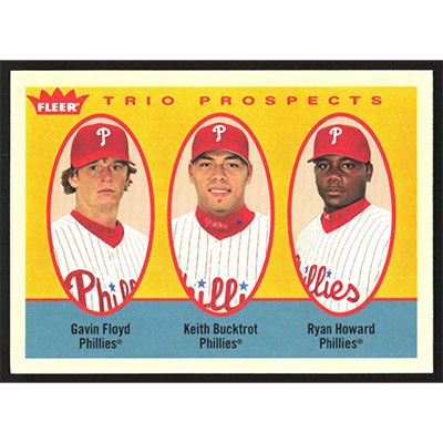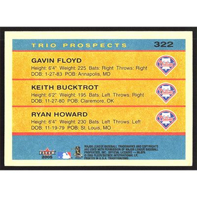This is a 2005 Fleer Tradition Gavin Floyd, Keith Bucktrot and Ryan Howard Trio Prospects baseball card. The card is #322 and pictures show condition. Team(s): Philadelphia Phillies