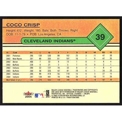 This is a 2005 Fleer Tradition Coco Crisp baseball card. The card is #39 and pictures show condition.