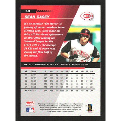 This is a 2005 Leaf Sean Casey baseball card. The card is #58 and pictures show condition.