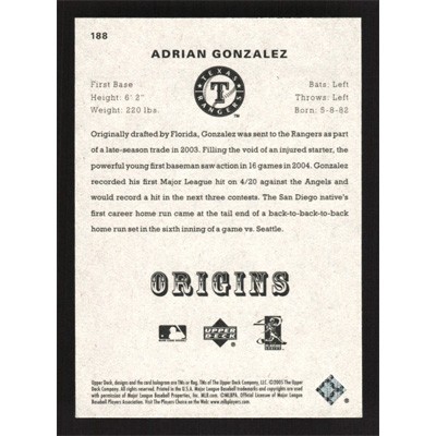 This is a 2005 Origins Adrian Gonzalez baseball card. The card is #188 and pictures show condition.