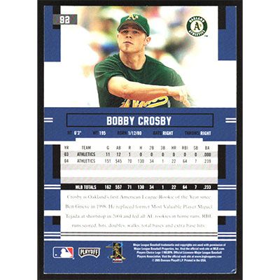 This is a 2005 Playoff Prestige Bobby Crosby baseball card. The card is #92 and pictures show condition.