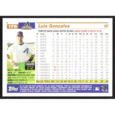 This is a 2005 Topps Luis Gonzalez baseball card. The card is #175 and pictures show condition.
