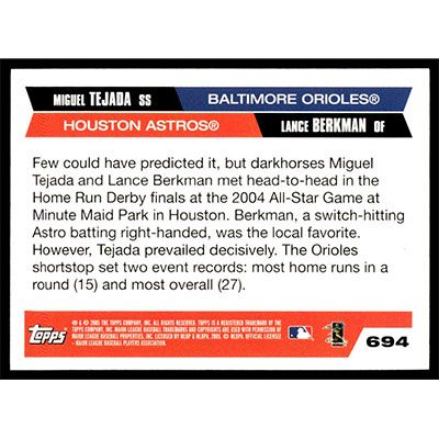 This is a 2005 Topps Lance Berkman and Miguel Tejada Kings of Swing baseball card. The card is #694 and pictures show condition. Team(s): Houston Astros/Baltimore Orioles