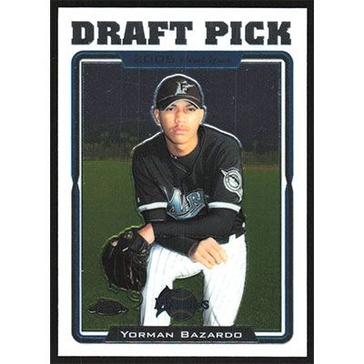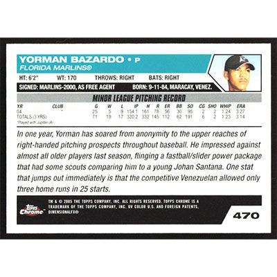 This is a 2005 Topps Chrome Yorman Bazardo First Year baseball card. The card is #470 and pictures show condition. Team(s): Florida Marlins Rookie Card (RC)