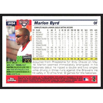 This is a 2005 Topps Chrome Update Marlon Byrd baseball card. The card is #UH54 and pictures show condition.