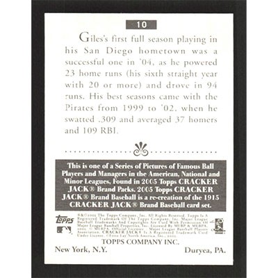 This is a 2005 Topps Cracker Jack Brian Giles baseball card. The card is #10 and pictures show condition.