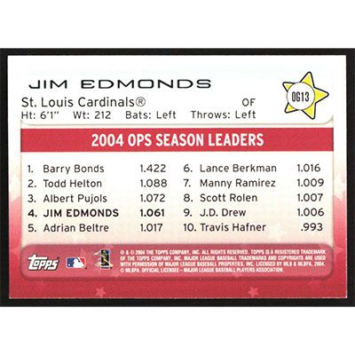This is a 2005 Topps Own the Game Jim Edmonds baseball card. The card is #OG13 and pictures show condition.