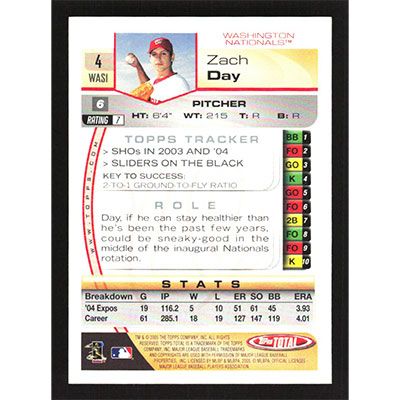 This is a 2005 Topps Total Zach Day baseball card. The card is #4 and pictures show condition.