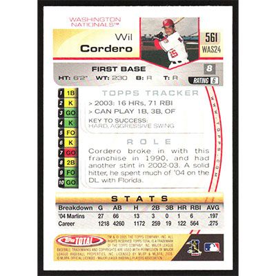 This is a 2005 Topps Total Wil Cordero baseball card. The card is #561 and pictures show condition.