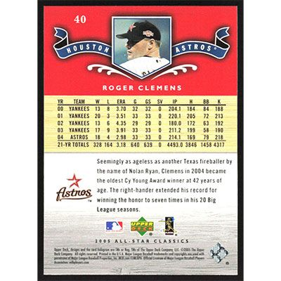 This is a 2005 UD All-Star Classics Roger Clemens baseball card. The card is #40 and pictures show condition.