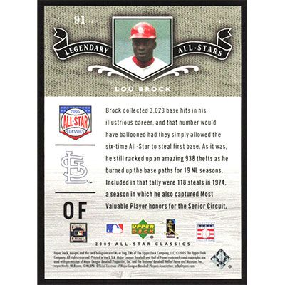 This is a 2005 UD All-Star Classics Lou Brock Legendary All-Stars baseball card. The card is #91 and pictures show condition. Team(s): St. Louis Cardinals