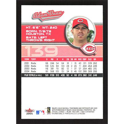 This is a 2005 Ultra Adam Dunn baseball card. The card is #139 and pictures show condition.