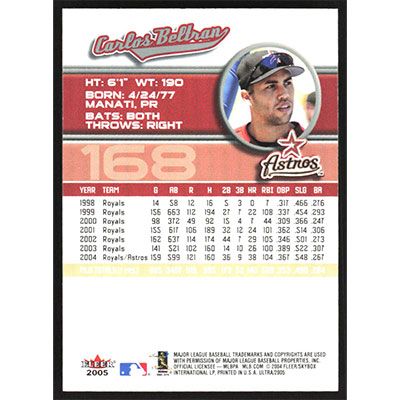 This is a 2005 Ultra Carlos Beltran baseball card. The card is #168 and pictures show condition.
