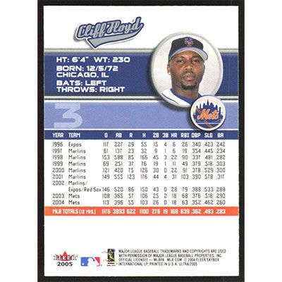 This is a 2005 Ultra Cliff Floyd baseball card. The card is #3 and pictures show condition.