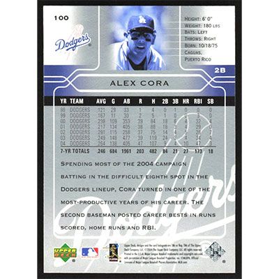 This is a 2005 Upper Deck Alex Cora baseball card. The card is #100 and pictures show condition.