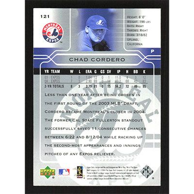 This is a 2005 Upper Deck Chad Cordero baseball card. The card is #121 and pictures show condition.