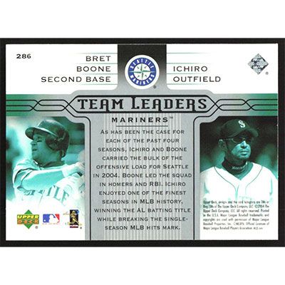 This is a 2005 Upper Deck Bret Boone and Ichiro Team Leaders baseball card. The card is #286 and pictures show condition.